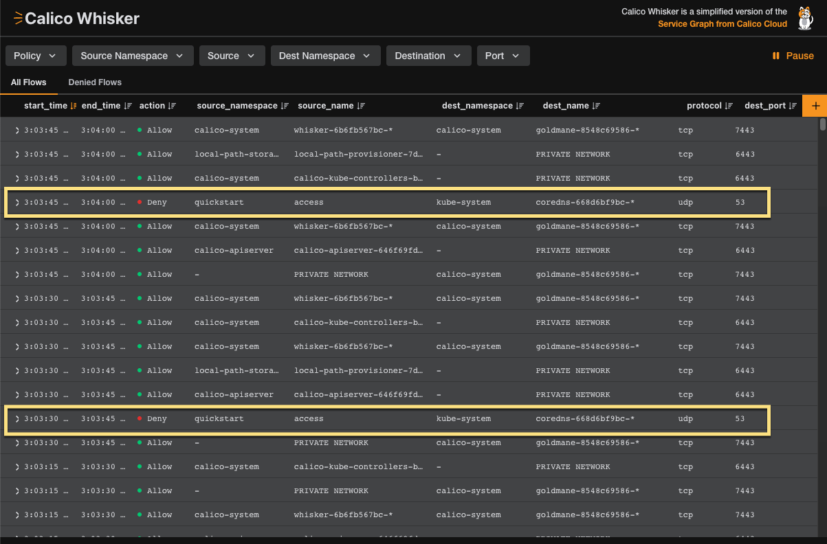 4. Return to your browser to see the denied flow logs appear in the Whisker web console. You should see two denied flows to coredns.